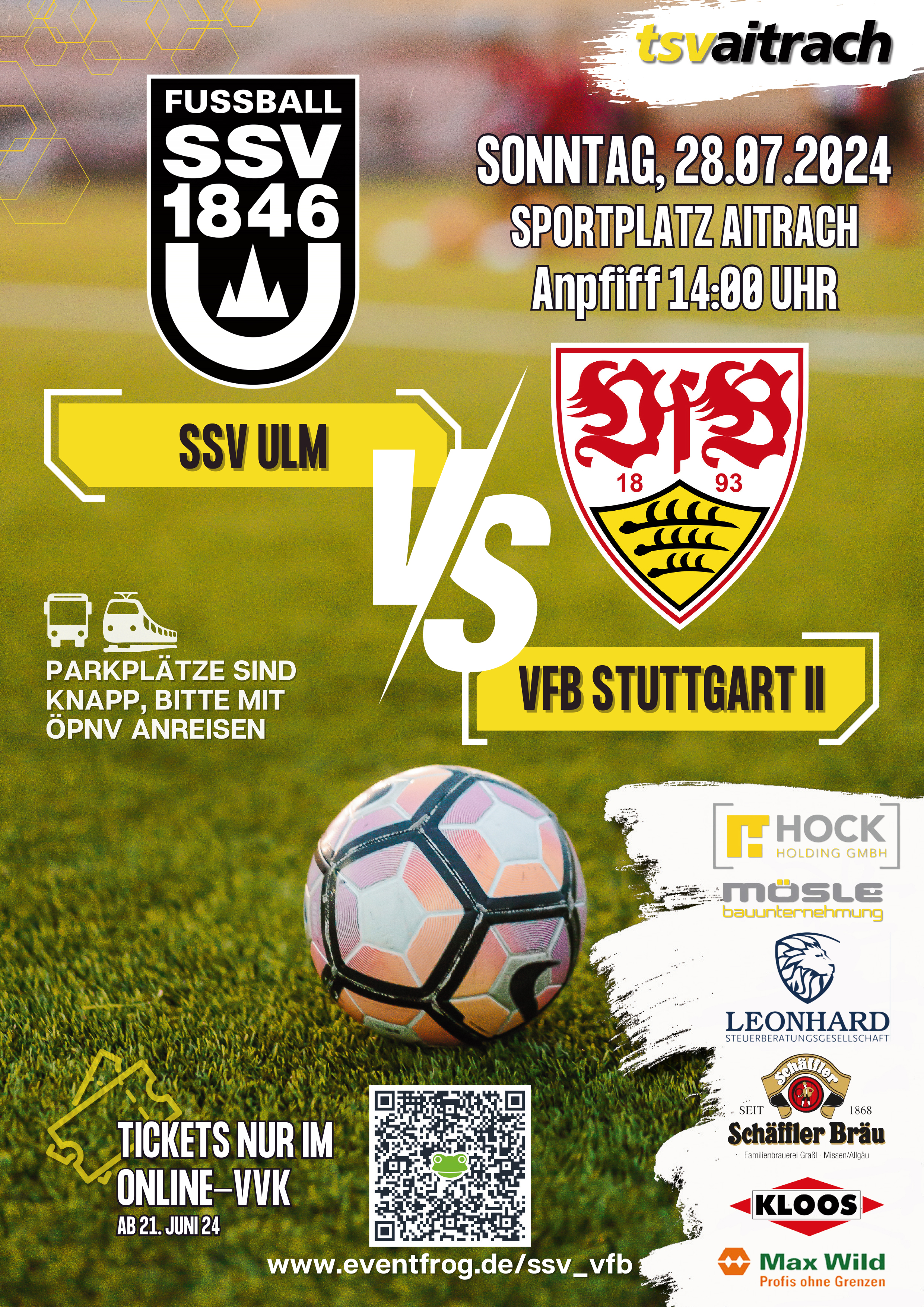 Liebe Aitracher Fußballfreunde, am 28. Juli trifft der SSV Ulm, Aufsteiger in die zweite Bundesliga, auf unserem heimischen Rasen auf den VfB Stuttgart II, der gerade in die dritte Liga aufgestiegen ist. Dieses sportliche Großereignis sollten Sie sich nicht entgehen lassen! Damit jeder eine Chance auf ein Ticket hat, veranstalten wir einen Vorverkauf im Treff, speziell für Menschen, die keinen Internetzugang haben, oder sich nicht zutrauen, Karten über das Internet zu kaufen. Kommen Sie dazu am Donnerstag, den 20.06. zwischen 18 und 20 Uhr am Treff vorbei und sichern Sie sich Tickets zum Preis von 10€. (Bitte Bargeld möglichst passend mitbringen, keine Kartenzahlung möglich). Für alle Anderen startet der Online Ticketverkauf einen Tag später am Freitag 21.6. 2024 um 8:00 Uhr unter www.eventfrog.de/ssv_vfb Wir freuen uns auf ein ausgelassenes Fußball Spektakel mit vielen heimischen Zuschauern!